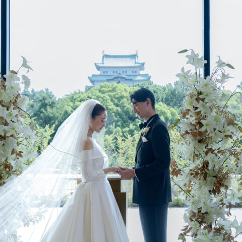 エスパシオ ナゴヤキャッスルの絢爛たる空間を舞台に、永遠の愛の誓いを。黎明の間にて、本格的なキリスト教式や日本伝統の神前式をはじめご両家の繁栄を願うオリジナルセレモニーなどおふたりらしいスタイルの挙式をご提案いたします。