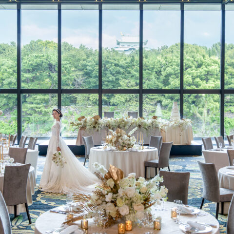 名古屋城を望む特別な空間、国内最大級のスケールを誇る会場。屏風絵や光の演出に彩られまるで芸術の中にいるかのようなひとときをお届けします。贅を尽くした設えが、ゲストを非日常の世界へと誘います。
