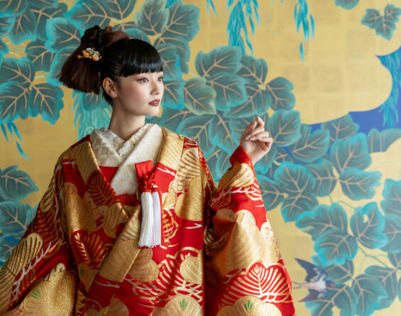 【アートミュージアムホテルで叶う唯一無二の撮影スポット】黄金に輝く象徴的な空間での佇まいや所作を通して、当日の情景などを思い描いていただけます。