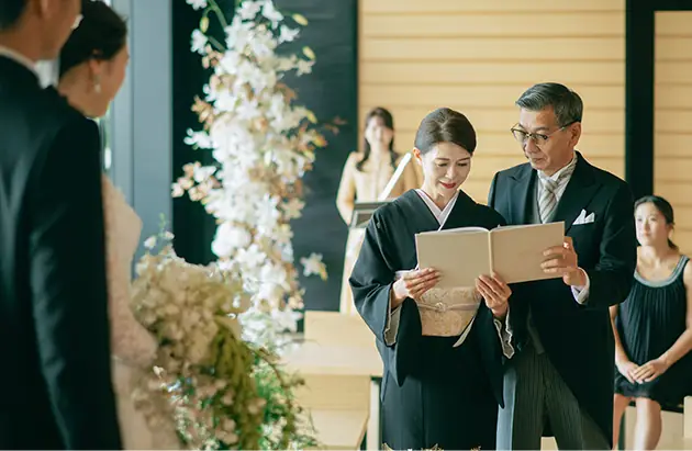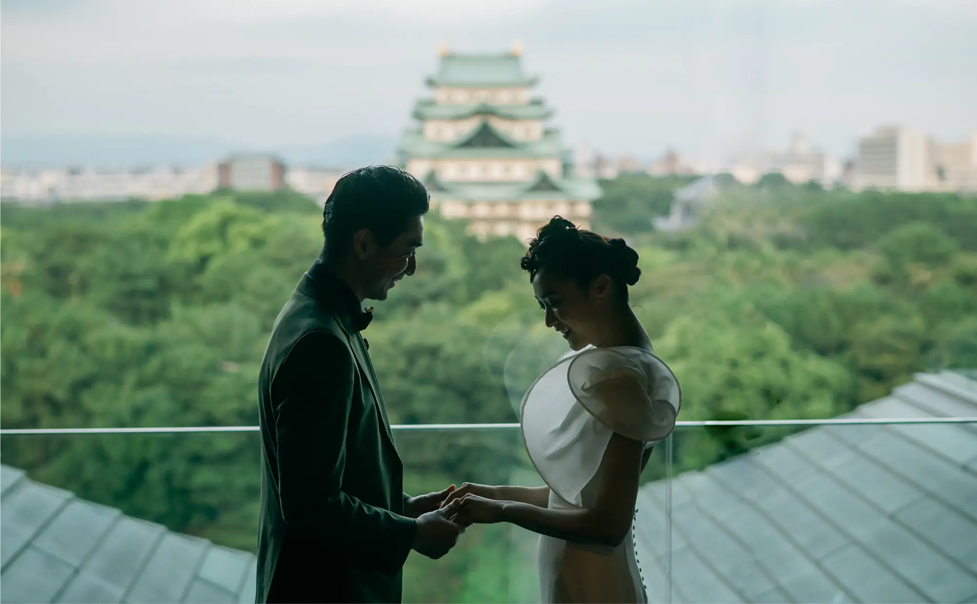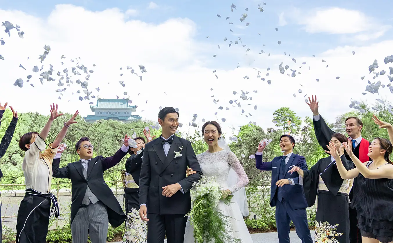 日本古来の祝言を大切にしたオリジナルセレモニー「華婚式」から、名古屋城を目の前に臨むテラスでのフラワーシャワーまで。両家の絆を結び、大切なゲストの繁栄を願うセレモニータイム。